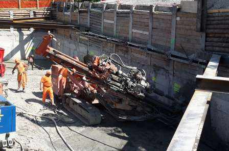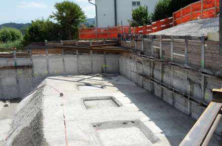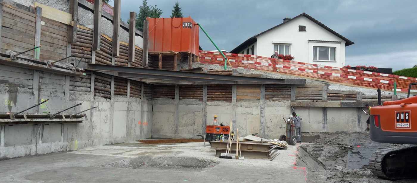 Das Bauprojekt am Pilgerweg in Richterswil besteht aus einem Mehrfamilienhaus mit zwei Untergeschossen und drei Obergeschossen in massiver Bauweise. Der Neubau bindet bergseitig rund 6 m in den Baugrund ein. Zur Sicherung der Baugrube, im als Rutschhang bekannten Gebiet, wurde bergseitig eine rückverankerte Rühlwand erstellt. Gegenüber dem Pilgerweg konnte nicht geankert werden, weshalb die vertikale Rühlwand mit Schrägspriessen in die Baugrube abgestützt werden musste. Die restlichen Bereiche der Baugrube konnten 1:1 geböscht resp. mit Geröllbetonauflagen gesichert werden.