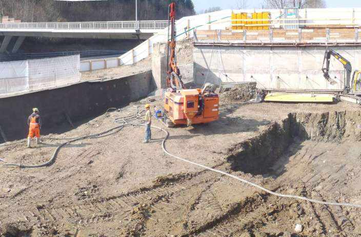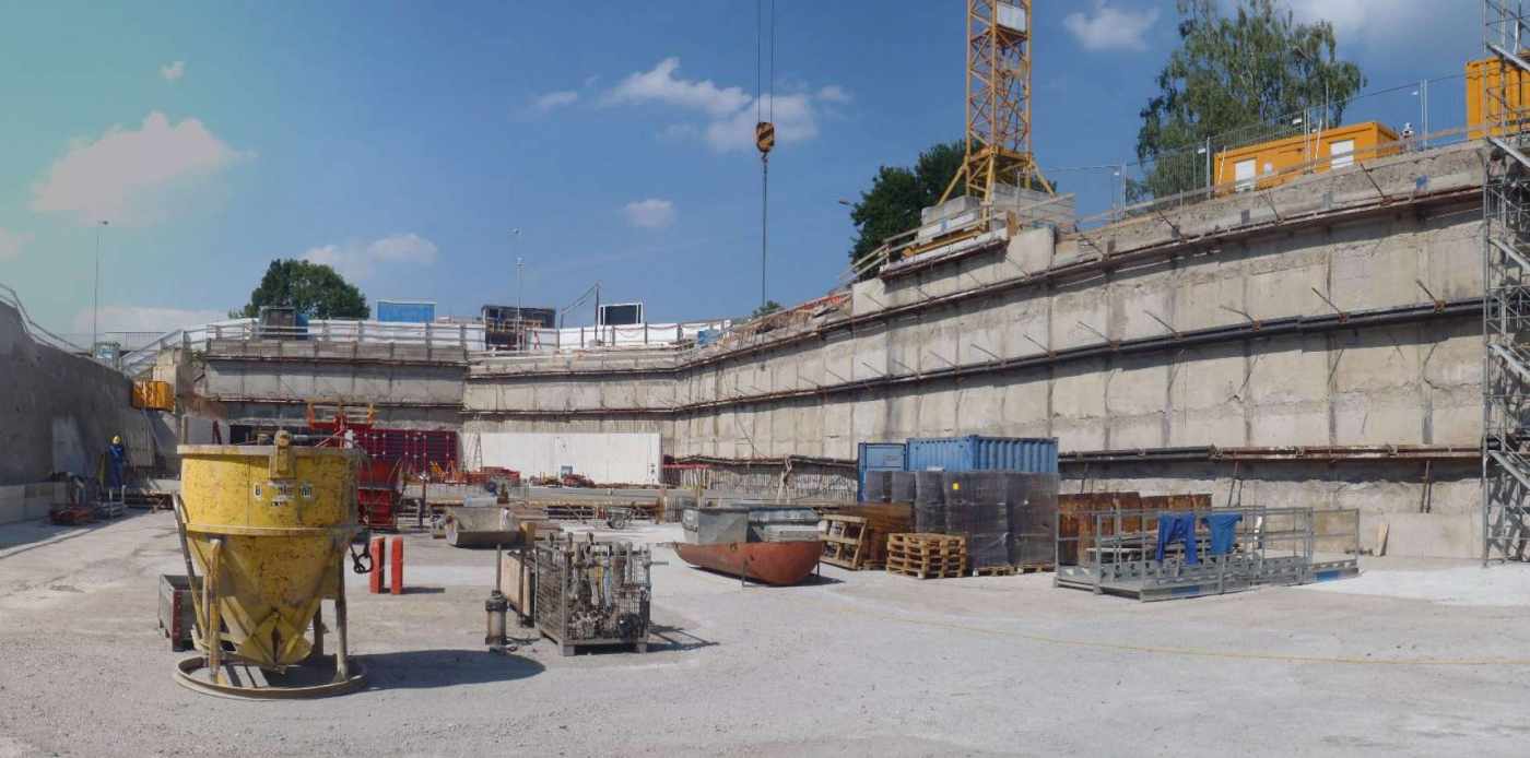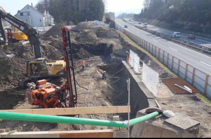 Unmittelbar neben der Autobahn wurde eine 10m tiefe Baugrube ausgehoben. Die Baugrubensicherung erfolgte mittels einer Rühlwand und teilweise mit einer Bodenvernagelung. Diese gemischte Bauweise ist das Resultat der Optimierung im Hinblick auf die Projektrandbediungen inklusive Wirtschaftlichkeitsbetrachtungen.
